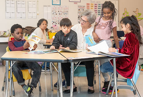 Elementary school students with their mentor Carol Tyson in a literacy mentoring session